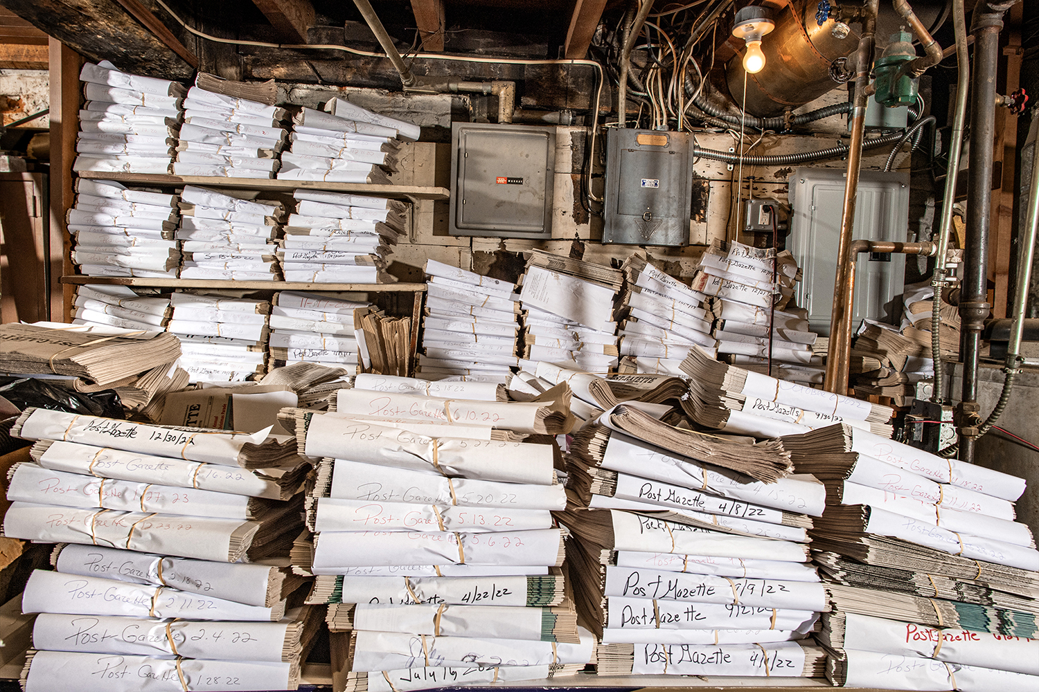 You notice some of the same things in every local newsroom: a printout of the First Amendment, a stapler labeled for the photo desk, history books of the town […] I look at these dilapidated rooms and think: ‘this is an entire town’s history that exists only here’.