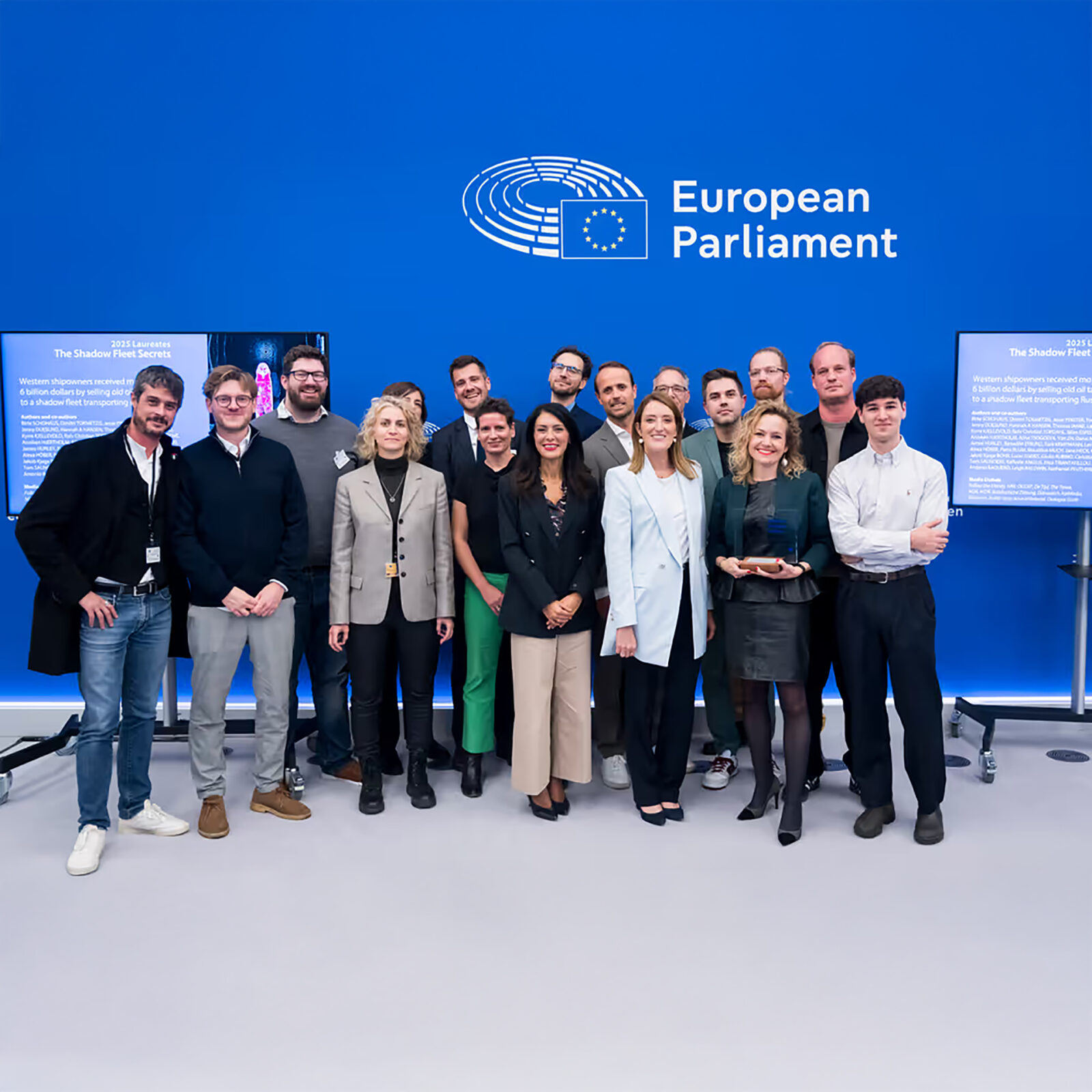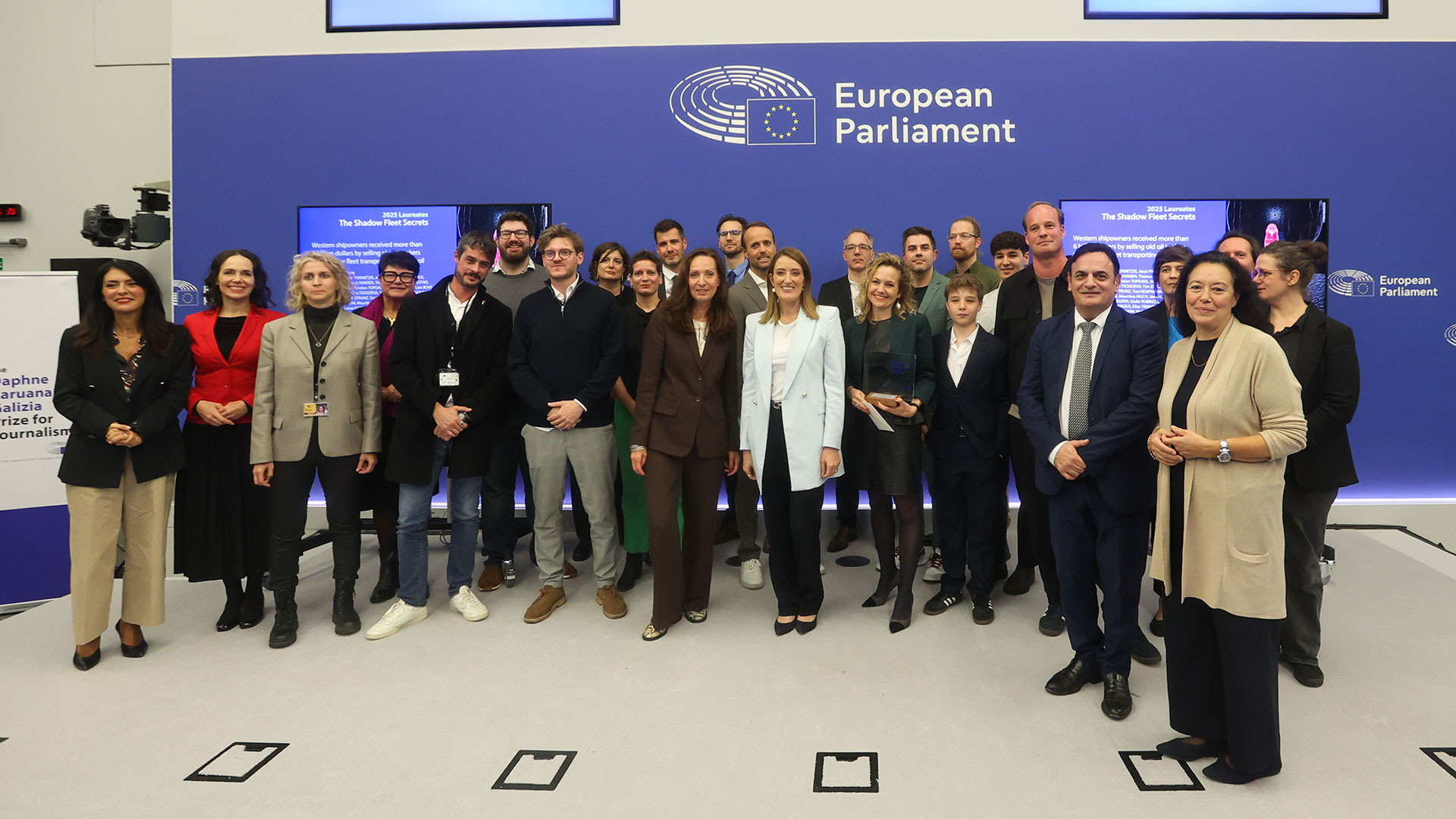 The 2025 Daphne Caruana Galizia Prize for journalism was awarded to the investigation into the Russian shadow fleet. Photo: Fred Marvaux / European Union — Source: European Parliament