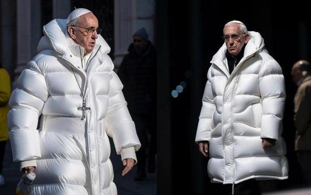 Αυτή η εικόνα του Πάπα Φραγκίσκου Α’ με ένα λευκό μπουφάν Balenciaga, που έγινε viral, ξεγέλασε εκατομμύρια χρήστες στα μέσα κοινωνικής δικτύωσης πριν να αποκαλυφθεί ότι είχε δημιουργηθεί με τεχνητή νοημοσύνη, χρησιμοποιώντας την εντολή «κείμενο σε εικόνα» (text-to-image prompt) του Midjourney. Ένα από τα βασικά στοιχεία ανίχνευσης της τεχνητής νοημοσύνης ήταν το γεγονός ότι ο σταυρός του κρεμόταν στο στήθος του με ανεξήγητο τρόπο, αφού στη θέση του άλλου μισού της αλυσίδας βρισκόταν μόνο το λευκό μπουφάν. Ο δημιουργός της εικόνας, Πάμπλο Χαβιέρ (Pablo Xavier), δήλωσε στο BuzzFeed News: «Απλά σκέφτηκα ότι θα είχε πλάκα να δούμε τον Πάπα με ένα αστείο μπουφάν».