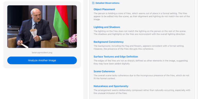 Το Image Whisperer (που αρχικά ονομαζόταν Detectai.live) «γεννήθηκε» από αυτήν την ιδέα. Το εργαλείο εκτελεί παράλληλη ανάλυση μεγάλων γλωσσικών μοντέλων μαζί με επεξεργασία Google Vision, εφαρμόζοντας τις αρχές της φυσικής, που μου δίδαξαν εκείνοι οι ειδικοί, αξιοποιώντας παράλληλα την ήδη διαθέσιμη υπολογιστική ισχύ. Το πιο σημαντικό είναι ότι, σε αντίθεση με τα περισσότερα εργαλεία τεχνητής νοημοσύνης, όταν δεν γνωρίζει κάτι, σας το λέει αντί να το μαντεύει.