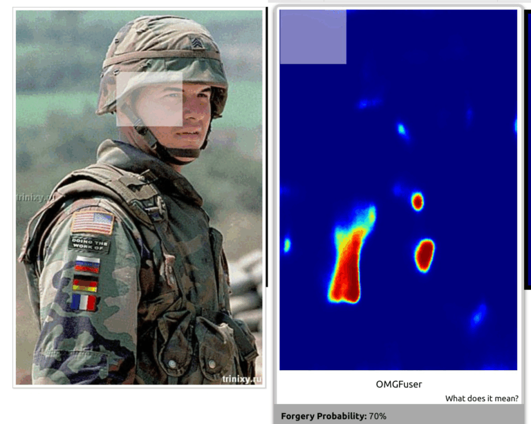 Ψηφιακά τροποποιημένη φωτογραφία ενός Αμερικανού στρατιώτη από το 2004 που έγινε viral. Το σήμα «DOING THE WORK OF» καθώς και οι ρωσικές, γερμανικές και γαλλικές σημαίες έχουν προστεθεί στην εικόνα. Το εργαλείο σάς δείχνει την πιθανή περιοχή αλλοίωσης και πόσο μεγάλη είναι η πιθανότητα είναι να έχει αλλοιωθεί. Εικόνες: Χενκ Βαν Ες