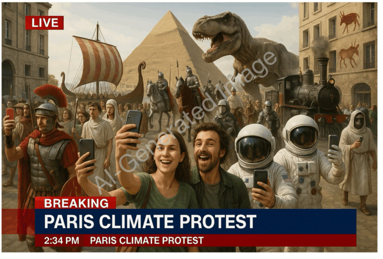Εικόνα που δημιουργήθηκε με τεχνητή νοημοσύνη και υποτίθεται ότι παρουσιάζει ένα στιγμιότυπο από δελτίο ειδήσεων σχετικά με διαδήλωση για το κλίμα στο Παρίσι. Εικόνα: Χενκ Βαν Ες