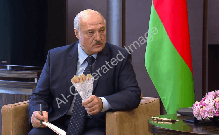 Εικόνα που δημιουργήθηκε από τεχνητή νοημοσύνη και παρουσιάζει τον πρόεδρο της Λευκορωσίας να κρατά ένα χωνάκι με τηγανιτές πατάτες σε μια επίσημη συνάντηση. Εικόνα: Χενκ Βαν Ες