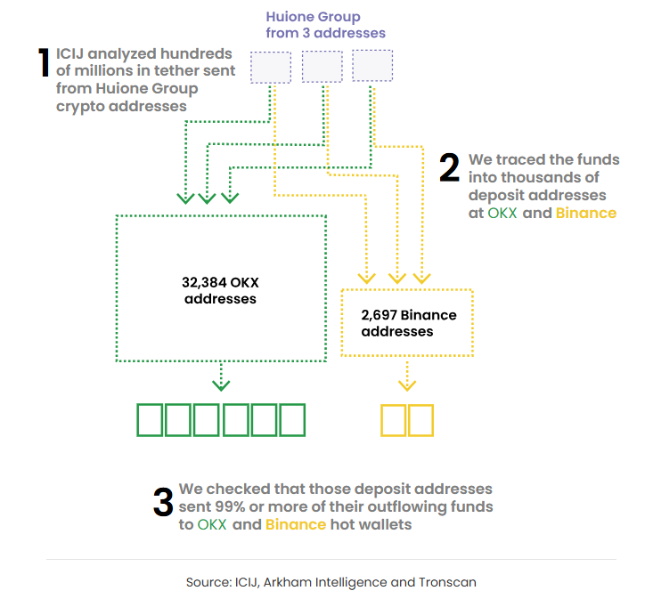 Στη συνέχεια, εντόπισαν παράνομες «διευθύνσεις πορτοφολιών», τα οποία είναι κωδικοί αποτελούμενοι από γράμματα και αριθμούς που προσδιορίζουν λογαριασμούς στο δημόσιο blockchain. Οι δημοσιογράφοι συνέλεξαν πληροφορίες από άτομα που είχαν πέσει θύματα απάτης, από δικαστικά και αστυνομικά έγγραφα, λίστες κυρώσεων, καταγγελίες σε ρυθμιστικές Αρχές καθώς και «δοκιμαστικές» συναλλαγές, που πραγματοποίησαν σε υπηρεσίες [αγοράς και πώλησης] κρυπτονομισμάτων.