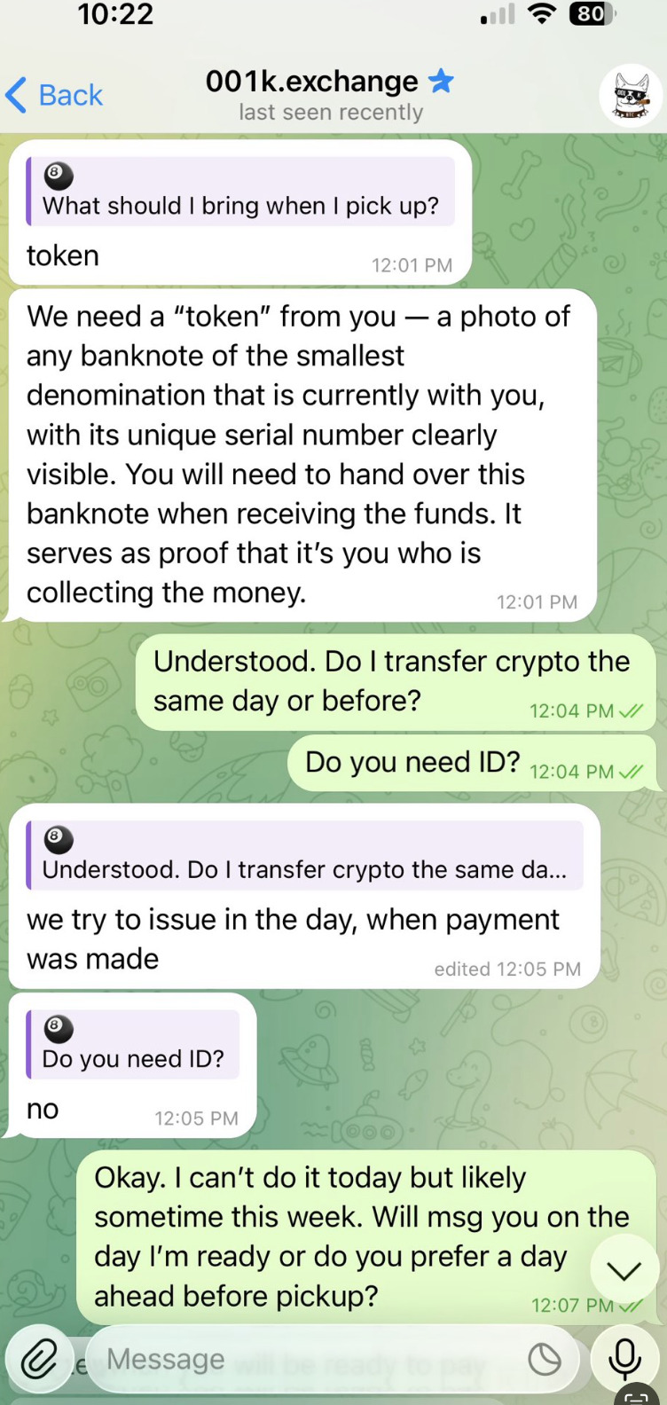 Λειτουργώντας μέσω κρυπτογραφημένων εφαρμογών ανταλλαγής μηνυμάτων όπως το Telegram, αυτοί οι κούριερ συναντούν τους πελάτες σε προκαθορισμένες τοποθεσίες, παραδίδουν δέματα μετρητών και παίρνουν κρυπτονομίσματα ως αντάλλαγμα, συχνά με επιπλέον χρέωση. «Το Telegram ήταν η οδός για να επικοινωνήσουμε με ορισμένες από αυτές τις υπηρεσίες και τελικά να γράψουμε για αυτές. Χωρίς τη δυνατότητα να επικοινωνήσουμε μαζί τους μέσω του Telegram, θα είχαμε πολύ λίγα στοιχεία», είπε ο Γούντμαν.