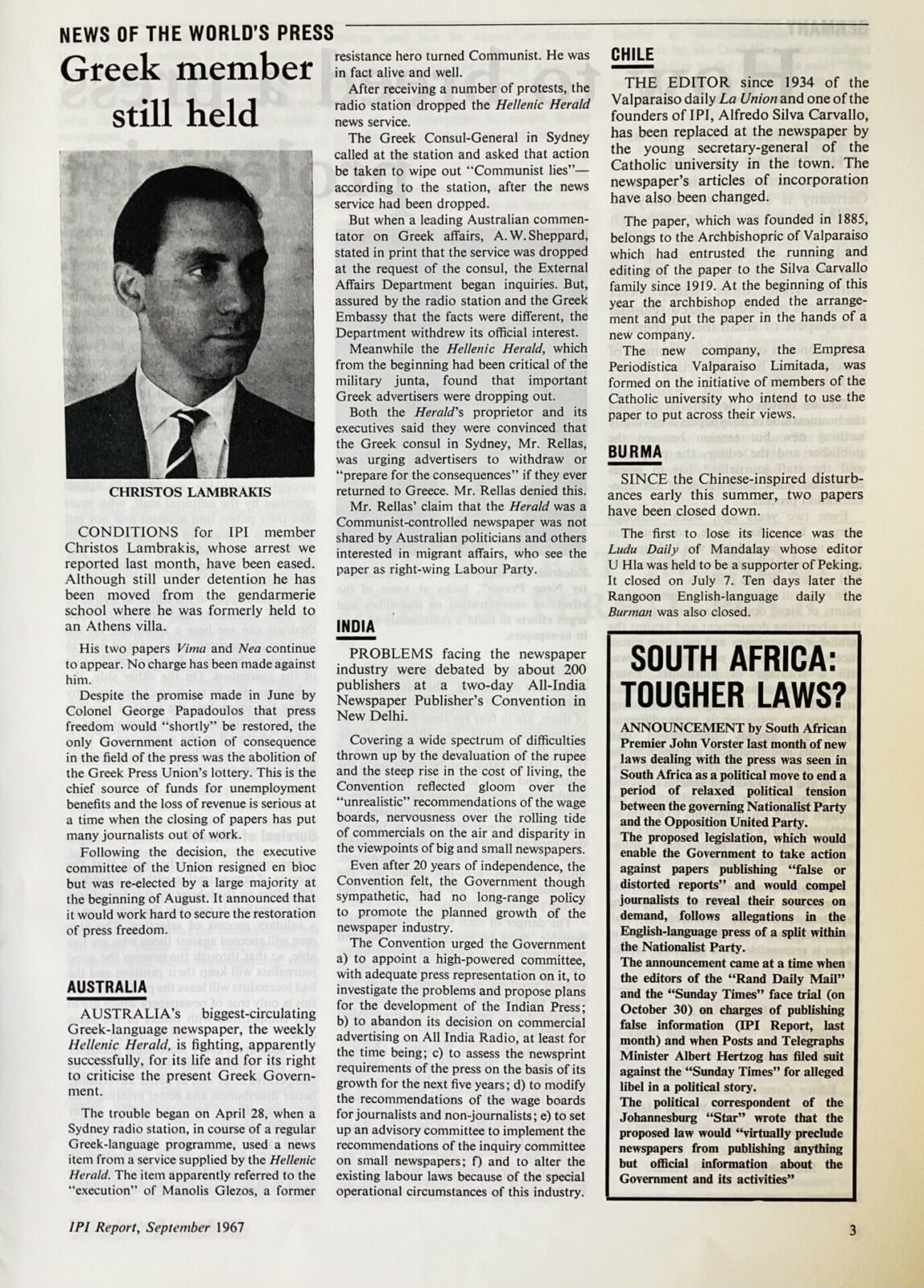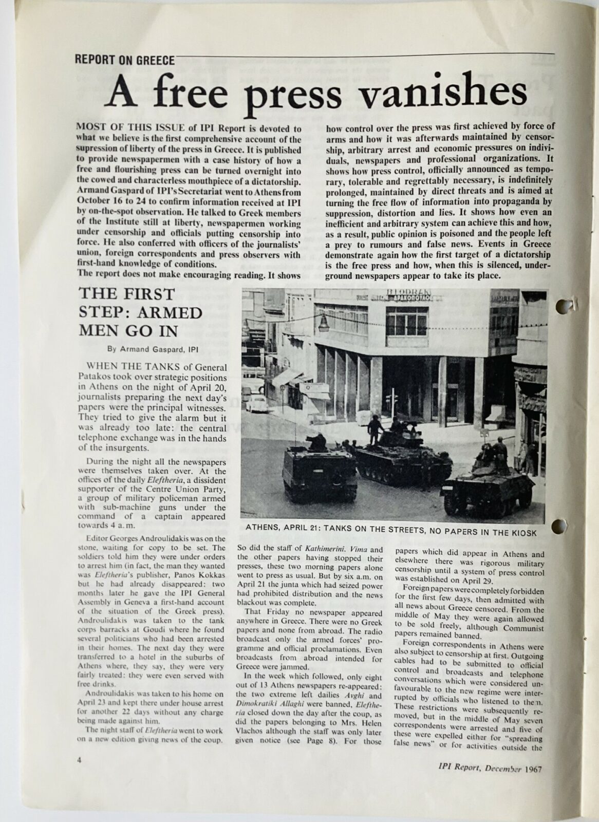 Με τα παραπάνω λόγια, η ιστορική Ελληνίδα εκδότρια και δημοσιογράφος Ελένη Βλάχου απευθύνεται στο Διεθνές Ινστιτούτο Τύπου (International Press Institute –IPI) το 1967, τη χρονιά που η ίδια διακόπτει την κυκλοφορία της εφημερίδας Καθημερινή, σε ένδειξη διαμαρτυρίας εναντίον του στρατιωτικού πραξικοπήματος, και υφίσταται τον κατ’ οίκον περιορισμό που της επιβάλλει η Χούντα. Η ανοιχτή επιστολή της δημοσιεύεται, τον Οκτώβριο της χρονιάς εκείνης, στο έκτο τεύχος του 16ου τόμου του IPI Report.